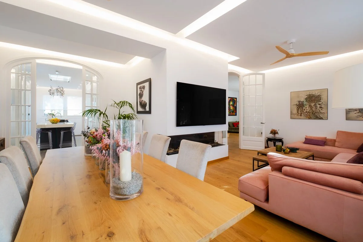 Zona de dia amb paviment de fusta massissa, una moderna llar de foc i les finestres originals que permeten l’entrada de llum i ventilació natural