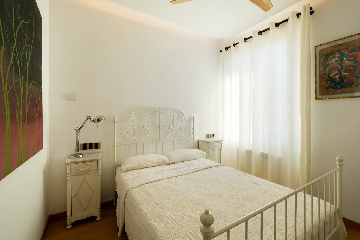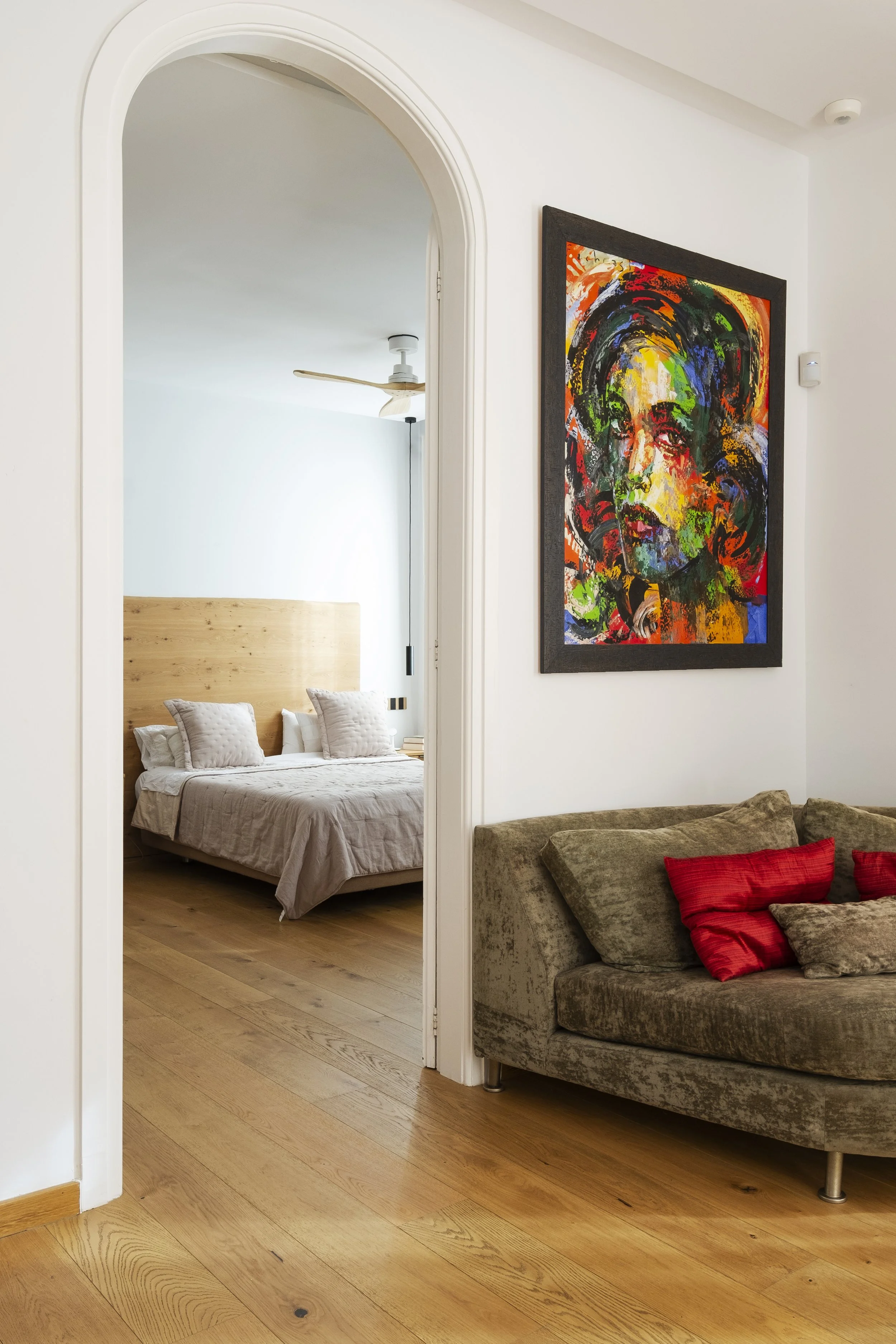 Un dormitori amb il·luminació indirecta, paviment natural. Portes i armari mantinguts amb portes lacades de nou.
