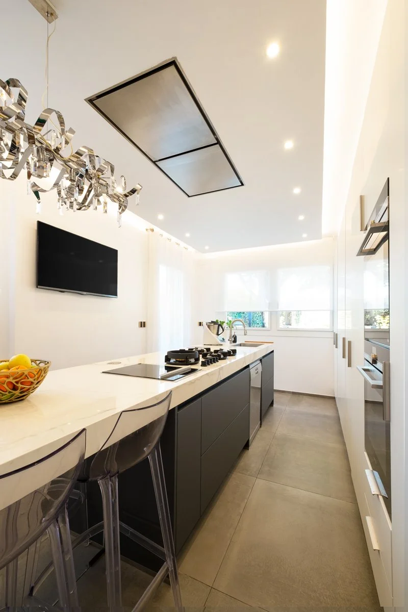 Illa central de la cuina amb taula per esmorzar, i mobles integrats i llum natural